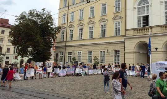 Op het plein voor het stadhuis in Lviv staan zo'n vijftig demonstranten keurig in een rij, elk voorzien van een bord met leuzen. Zij hebben het gemunt op een milieu bedreigende afvalberg in de stad en de kennelijk kwalijke rol van de bur...